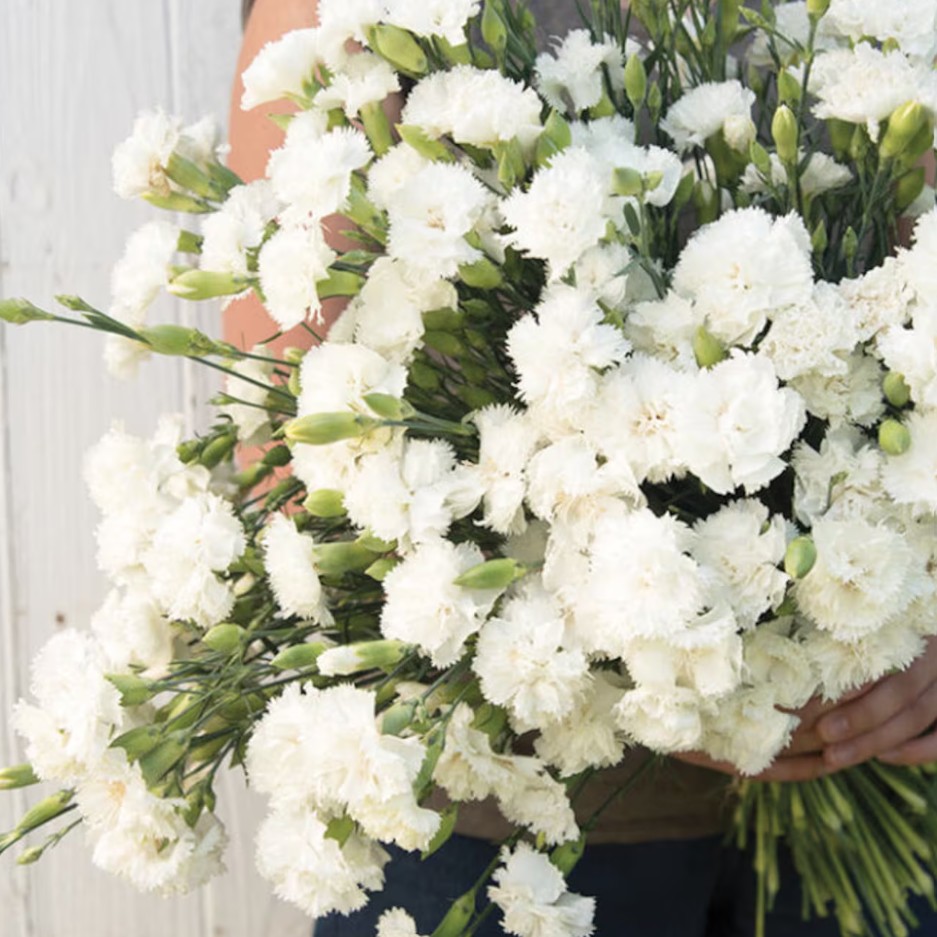 A fragrant heirloom dianthus with elegant, full white blooms and exceptional cut flower quality. The Jeanne Dionne Dianthus produces ruffled white flowers, often kissed with a hint of blush pink, atop strong stems with a rich, clove-like scent. Known as one of the fullest types of carnation, it’s ideal for borders, containers, or mass plantings. The long-lasting blooms are excellent for cutting, and the edible petals make beautiful garnishes. Thrives in cool conditions and can be direct sown eve… Companions: Lavender, Snapdragons, Valerians, Columbines, Geraniums, Bachelor’s Button, Roses, Verbena, Scented Geraniums, Coreopsis. Far from: Cacti, Succulents, Yuccas, Torenia, Lobelia, Impatiens. GaiaOrganics.ca |
