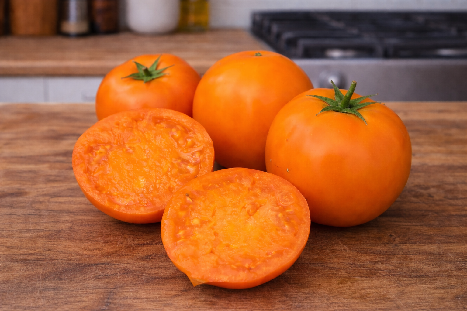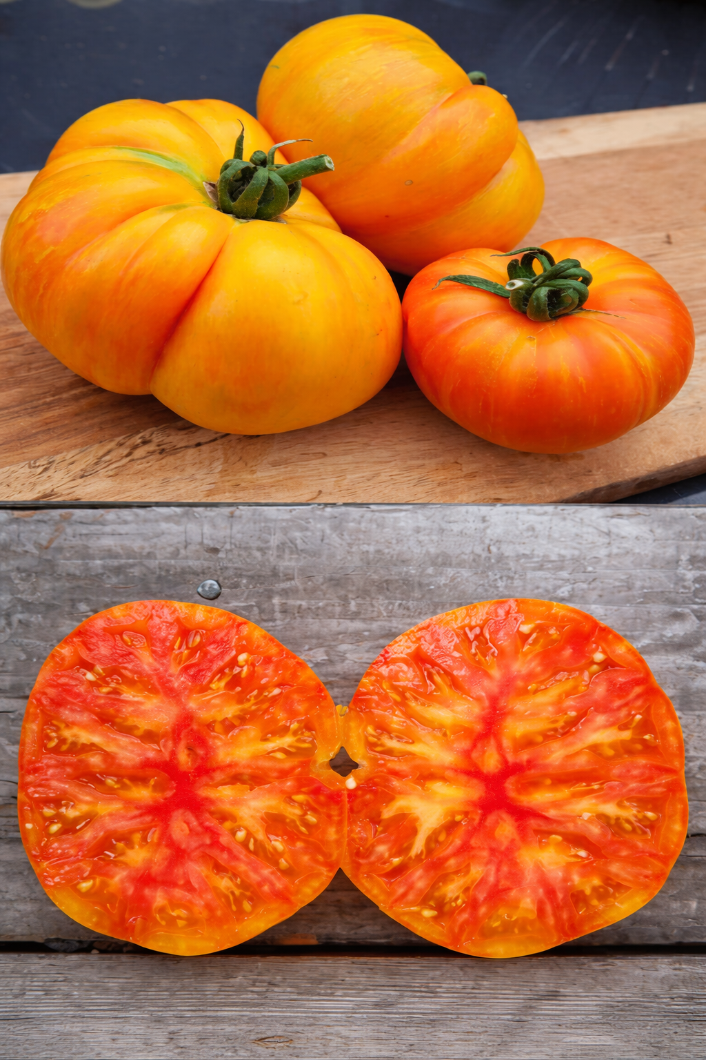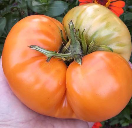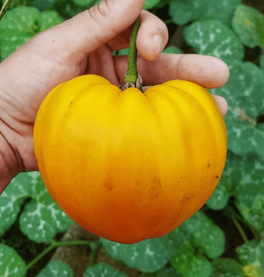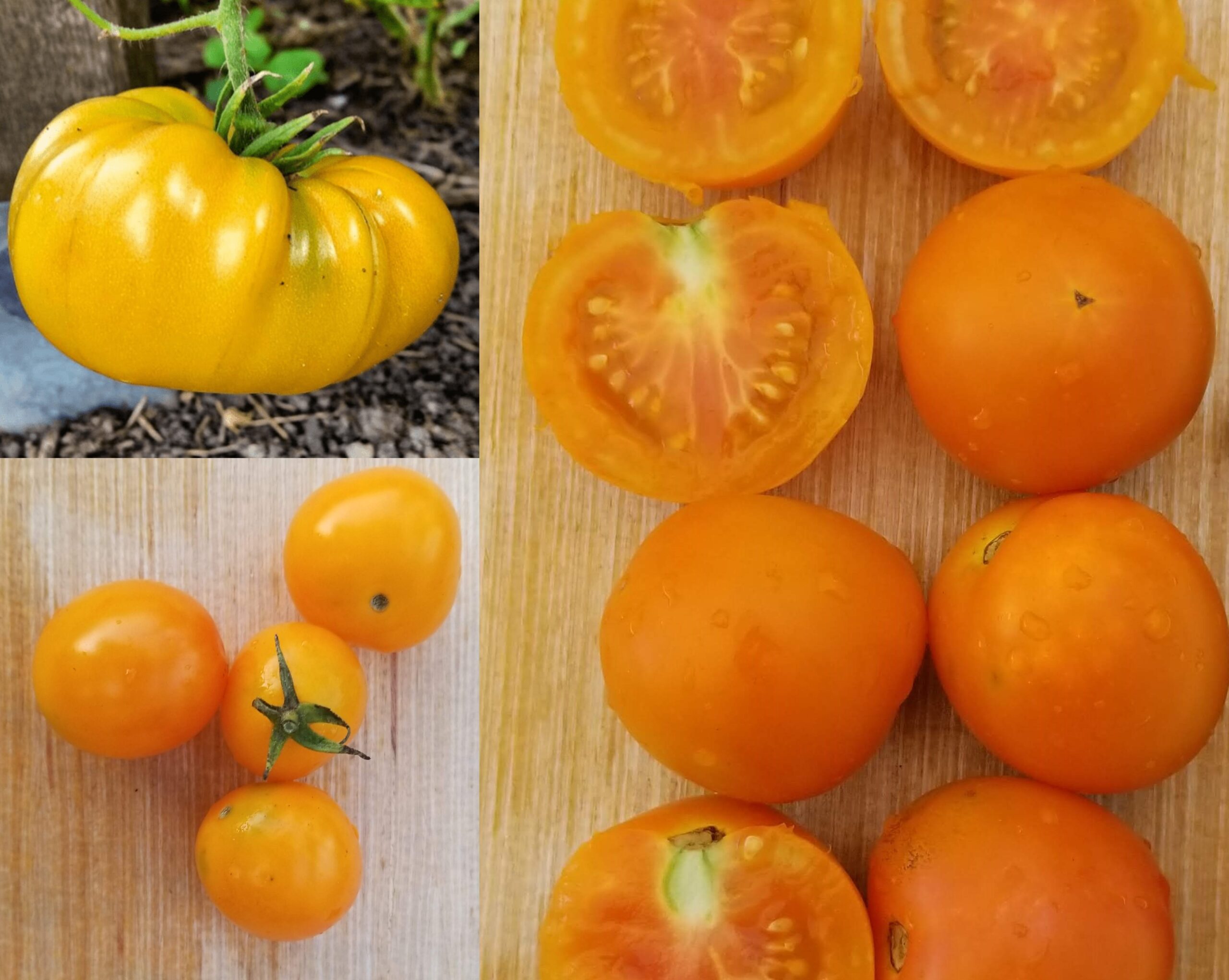| #1269 TOMATO (O.P.)(ORG.)(HERIT.) Tangerine Tomato Deep yellow-orange, tasty tangerine-shaped, beefsteak fruits are produced in quantity. Meaty, rich, and sweet. INDETERMINATE. ☀ Annual, Height: 3-5′, 24-36″(w) Seeds(25) Plants |