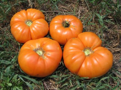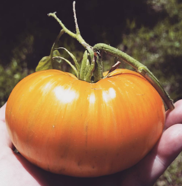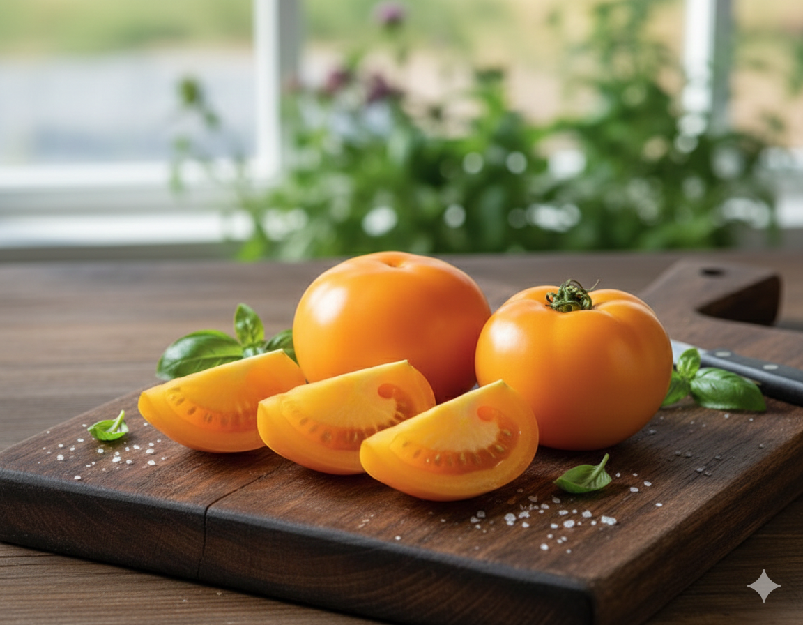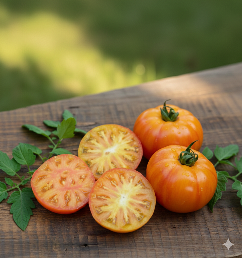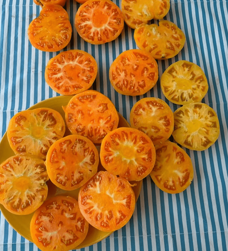 | #1269 TOMATO (O.P.)(ORG.)(HERIT.) Tangerine Tomato Deep yellow-orange, tasty tangerine-shaped, beefsteak fruits are produced in quantity. Meaty, rich, and sweet. INDETERMINATE. ☀ Annual, Height: 3-5′, 24-36″(w) Seeds(25) Plants |
