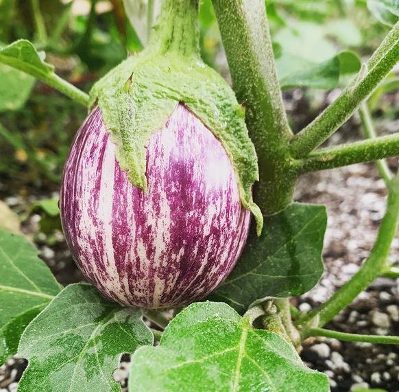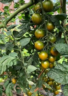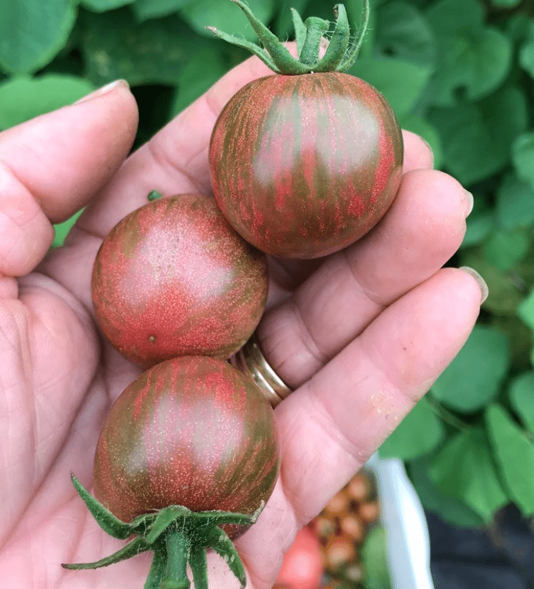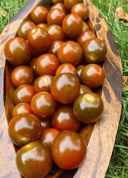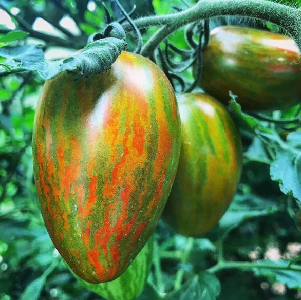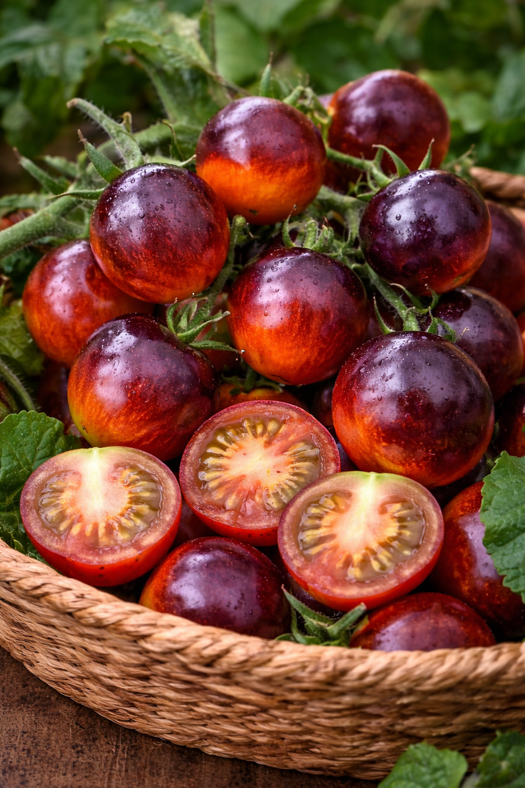 | #1283 TOMATO (O.P.)(ORG.)(HERIT.) Vernissage Black Tomato Red background with black stripes is highly productive and is a mid-season variety that is great for cocktail and salads. INDETERMINATE. ☀ Annual, Height: 4-6′, 24-36″(w) Seeds(25) Plants |