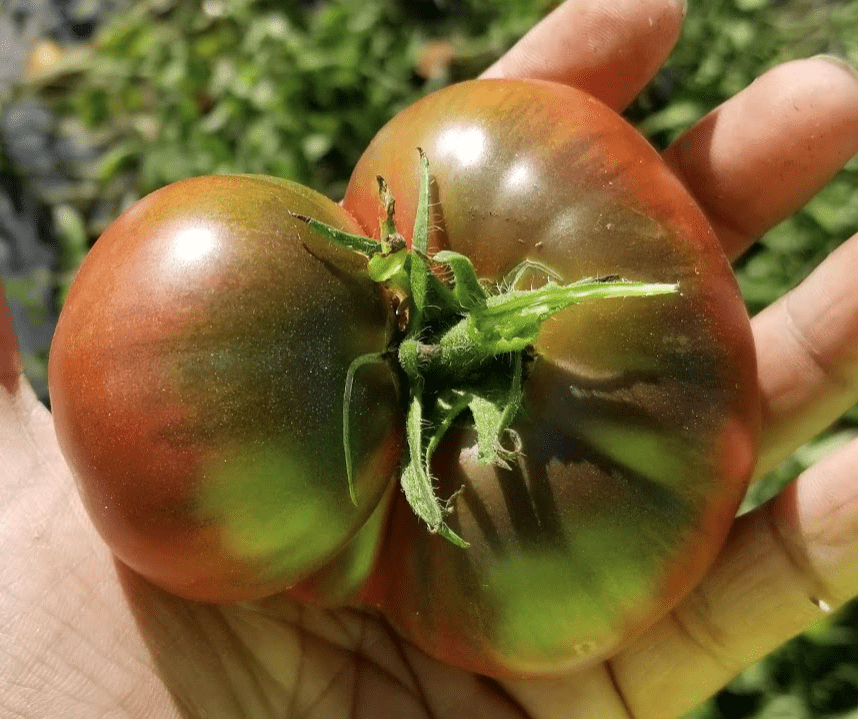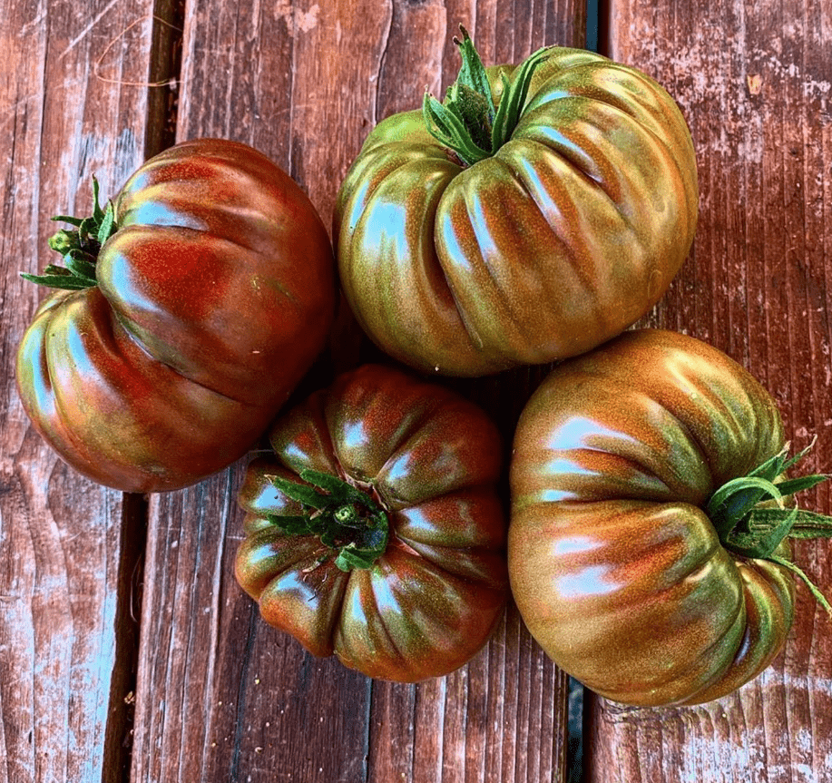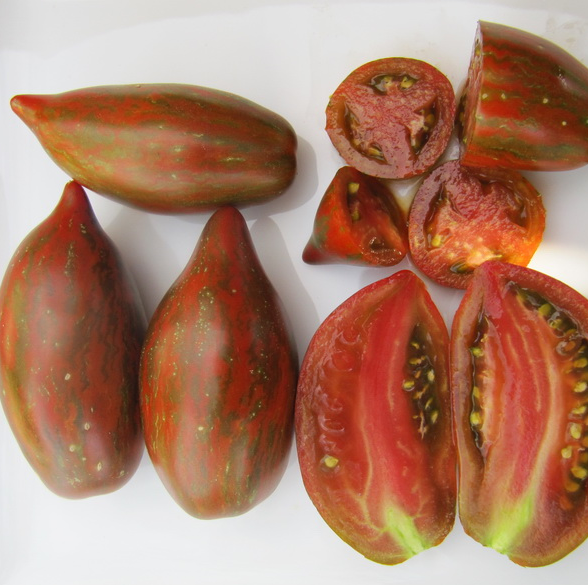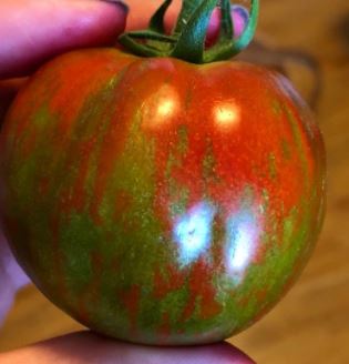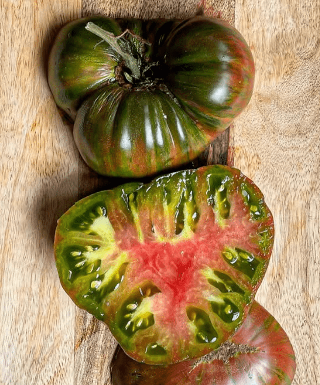 | #1243 TOMATO (O.P.)(ORG.)(HERIT.) Russian Cossack Tomato Russian Cossack Black tomato with pink and green stripes. SEMI-DETERMINATE. ☀ Annual, Height: 4-6′, 2-3′(w) Seeds(25) Plants |