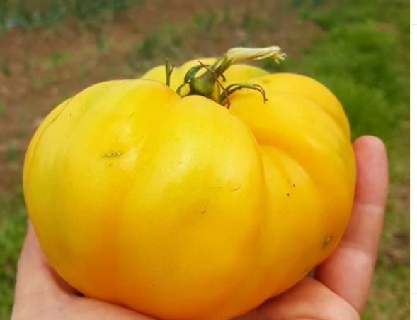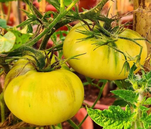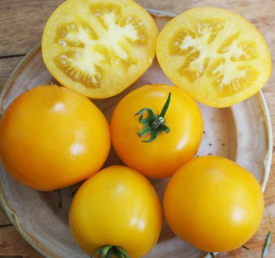 | #1287 TOMATO (O.P.)(ORG.)(HERIT.) Vernissage Yellow Tomato The bright yellow with pale cream stripes that fruits up to 2 oz. Great for relish trays. A variety from Ukraine. INDETERMINATE. ☀ Annual, Height: 3-5′, 18-24″(w) Seeds(25) Plants |