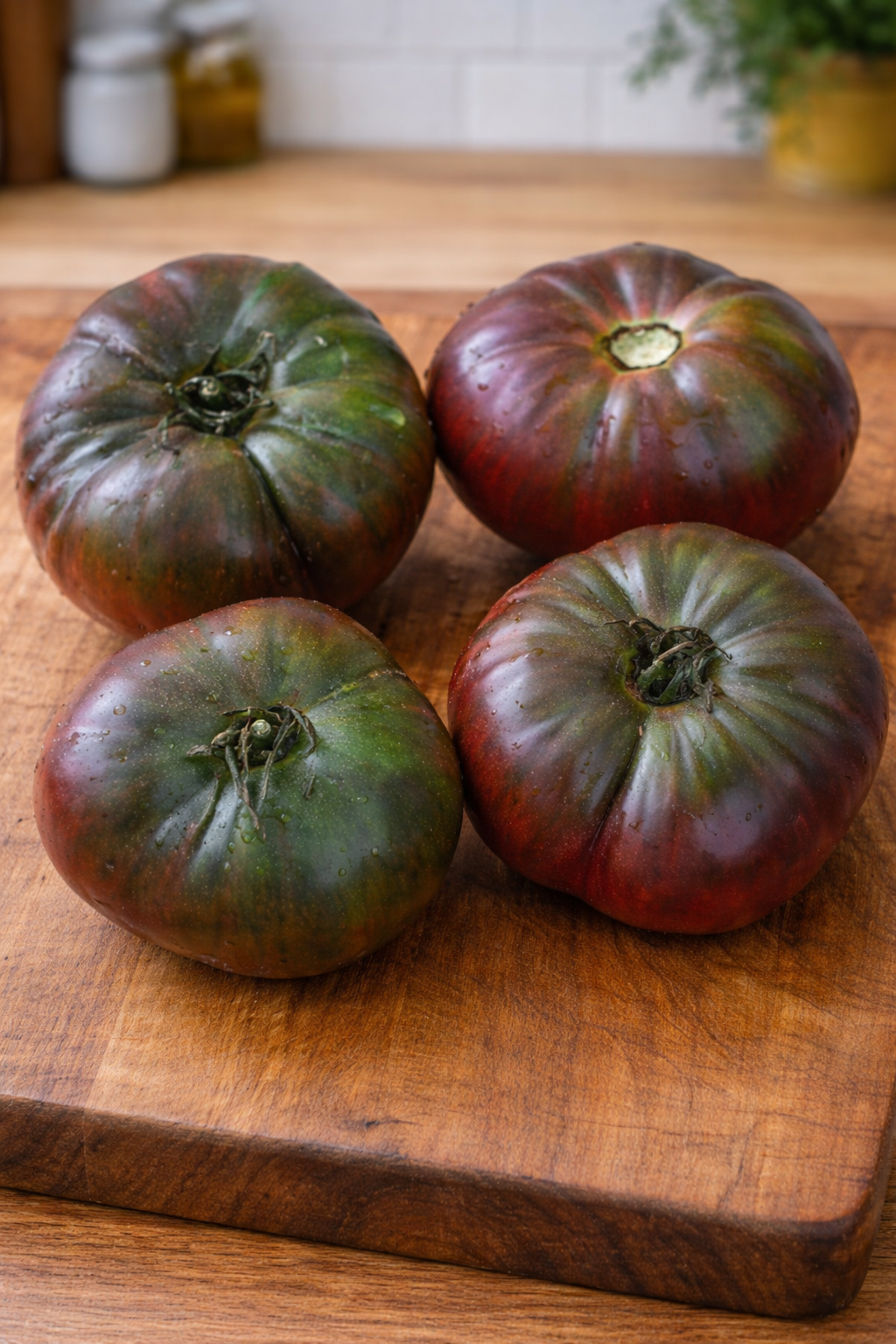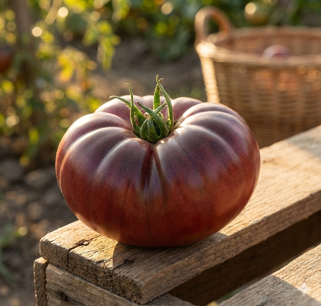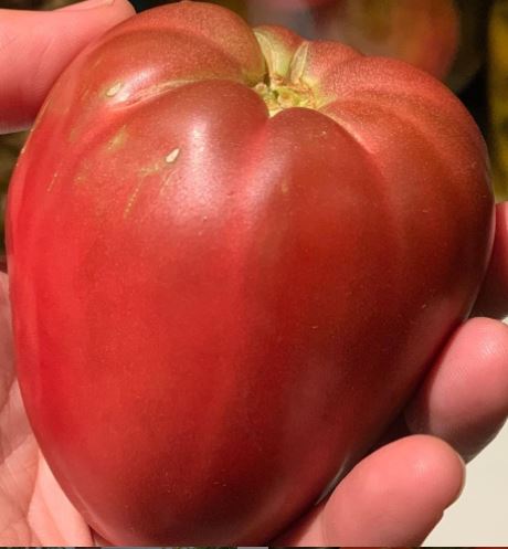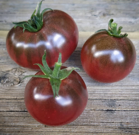 | #1256 TOMATO (O.P.)(ORG.) Southern Night Tomato Midseason. Very dark red to black colour with dark green shoulders. Medium size. Potato leaf variety. Heirloom from Russia. INDETERMINATE. ☀ Annual, Height: 4-6′, 2-3′(w) Seeds(25) Plants |