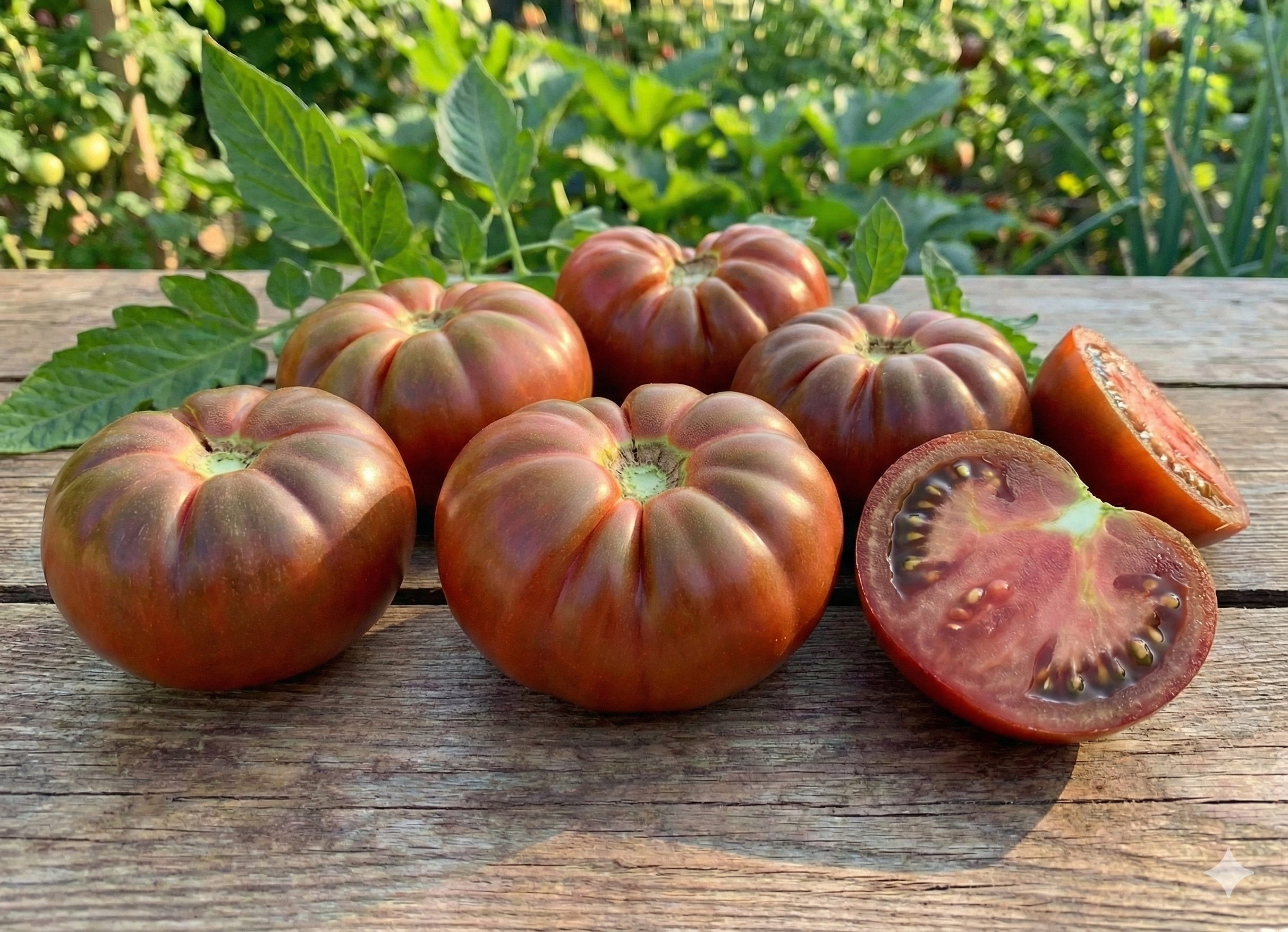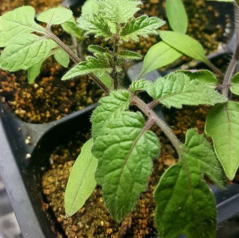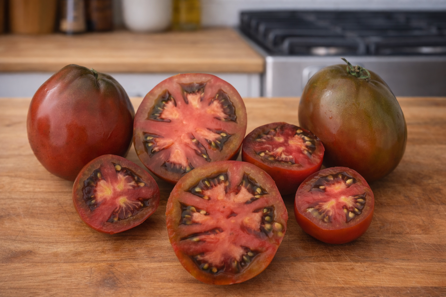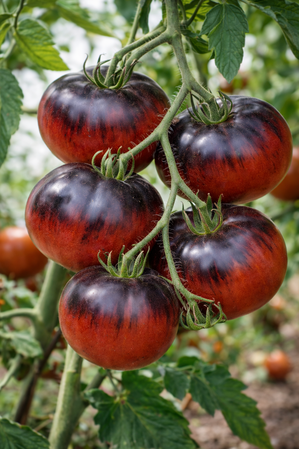 | #1256 TOMATO (O.P.)(ORG.) Southern Night Tomato Midseason. Very dark red to black colour with dark green shoulders. Medium size. Potato leaf variety. Heirloom from Russia. INDETERMINATE. ☀ Annual, Height: 4-6′, 2-3′(w) Seeds(25) Plants |