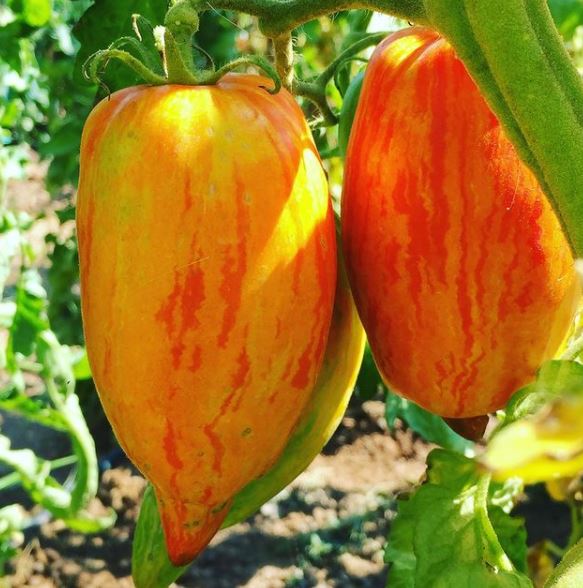 | #1261 TOMATO (O.P.)(ORG.)(HERIT.) Striped Roman Tomato Midseason. Large, plum shaped tomato. Skin is red with vertical orange stripes and flesh is red. Rich and juicy, soft but firm. INDETERMINATE. ☀ Annual, Height: 4-6′, 2-3′(w) Seeds(25) |