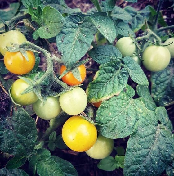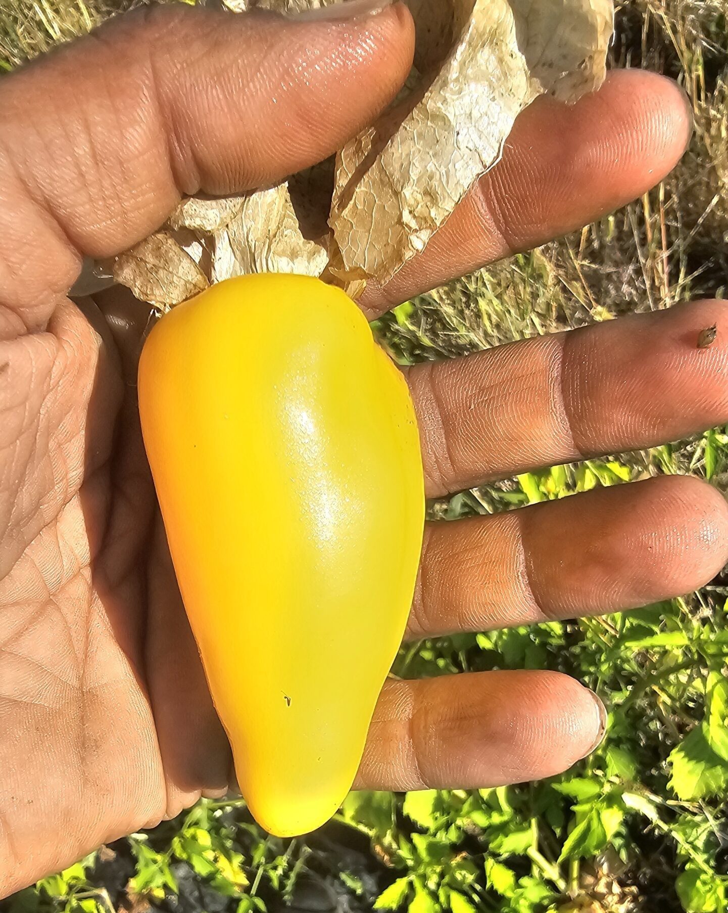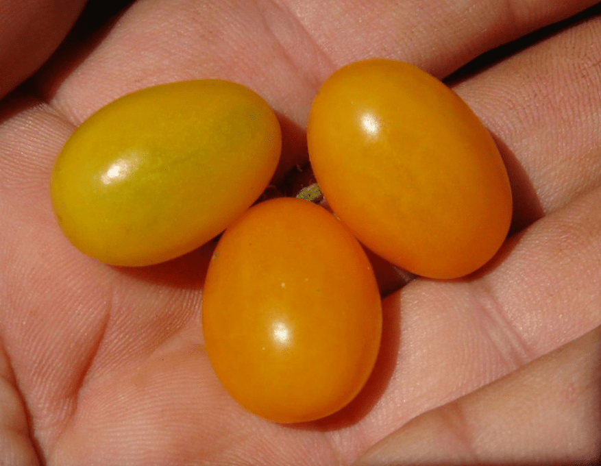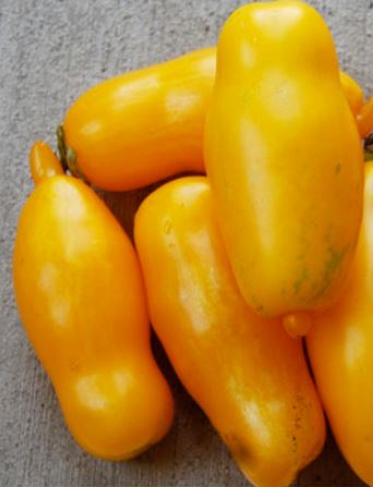 | #1301 TOMATO (O.P.)(ORG.)(HERIT.) Yellow Plum Tomato Oblong, 2cm (1”) yellow fruits are clustered tightly on the vine. Sweet taste. Good yield from vigorous plants. INDETERMINATE. ☀ Annual, Height: 4-6′, 2-3′(w) Seeds(25) Plants |
