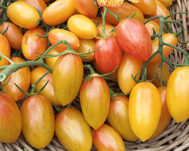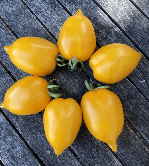 | #1300 TOMATO (O.P.)(ORG.)(HERIT.) Yellow Pear Tomato Variety from the 1700s. Yellow pear-shaped fruits in mid-season. Full, juicy flavor, low acid make these great for snacking and super in salads. Prolific yields of hundreds of fruits. INDETERMINATE. ☀ Annual, Height: 3-5′, 2-3′(w) Seeds(25) Plants |