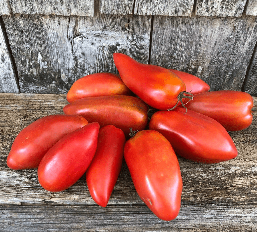 | #1249 TOMATO (O.P.)(ORG.)(HERIT.) San Marzano Tomato An old mysterious Italian variety that deep bright red, crack-resistant, and uniform looking tomato. Tomatoes don’t ripe at the same time so great for market gardeners. Little juice and very few seeds that makes it good for sauce. INDETERMINATE. ☀ Annual, Height: 6-8′, 2-3′(w) Seeds(25) Plants |
