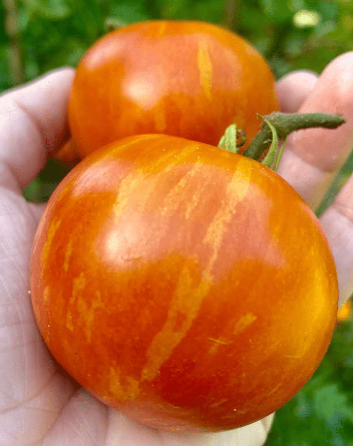 | #1276 TOMATO (O.P.)(ORG.)(HERIT.) Tigerella Tomato This adorable British heirloom cocktail tomato flaunts yellowish orange tiger-like stripes on bright vibrant red flesh, offering a juicy and fruity lightness that easily becomes a favorite. Thin skinned, it can have a tendency to split at the end of its ripening. An early producing variety with good heat and cold tolerance, developed by Dr. Lewis D… INDETERMINATE. ☀ Annual, Height: 3-5′, 18-24″(w) Seeds(25) Plants |