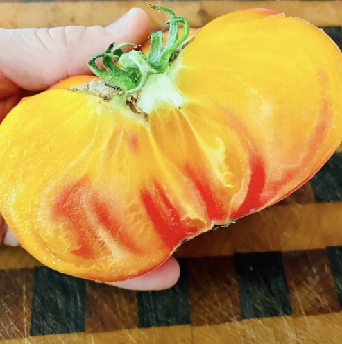 | #1281 TOMATO (O.P.)(ORG.)(HERIT.) Valencia Tomato Midseason 8-10 oz apricot-orange, oval shape tomato. A meaty, firm with very few seeds and tastes like a classic tomato. The cold tolerant variety must be staked. INDETERMINATE. ☀ Annual, Height: 4-6′, 2-3′(w) Seeds(25) Plants |