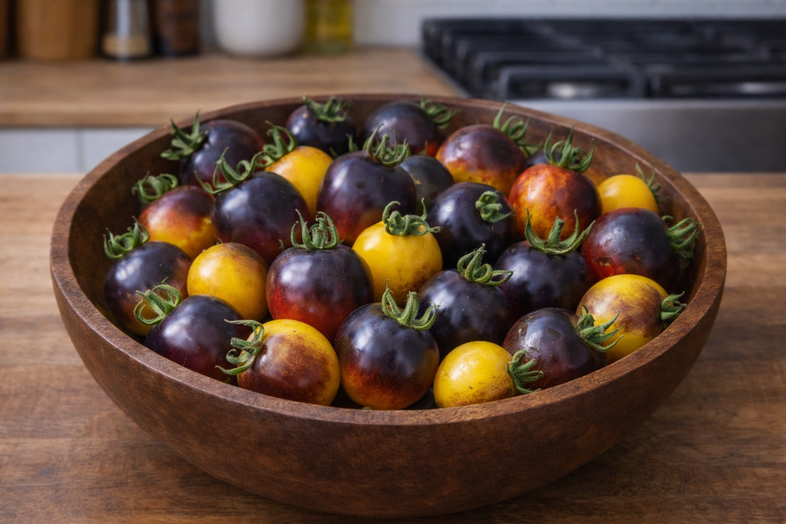 | #1286 TOMATO (O.P.)(ORG.)(HERIT.) Vernissage Tomato Mix A mix all different colours of vernissage varieties. Yellow, pink, black, and green colours of tomatoes. INDETERMINATE. ☀ Annual, Height: 6-8′, 2-3′(w) Seeds(25) |