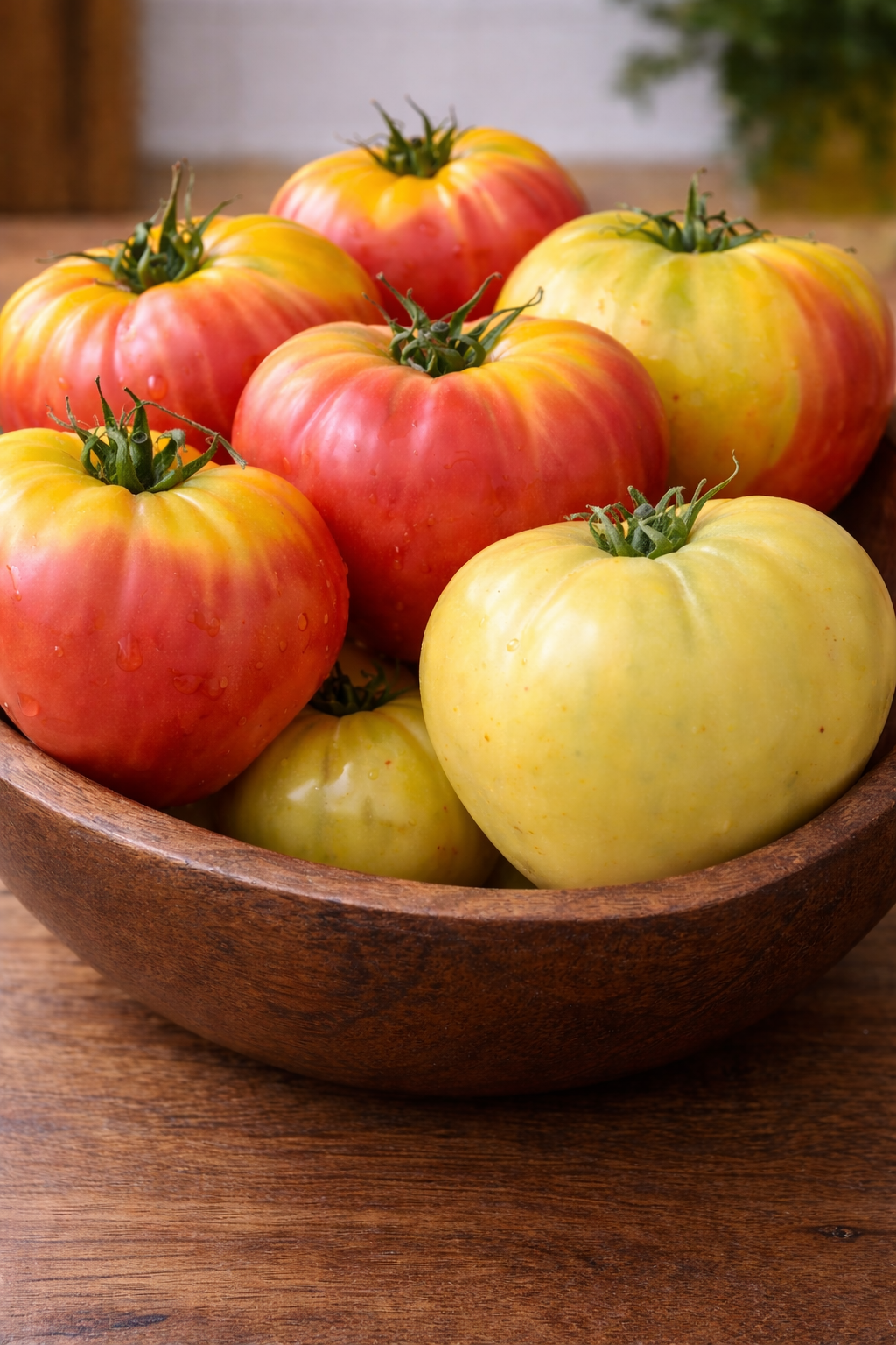 | #1225 TOMATO (O.P.)(ORG.) Rainbow Jazz Heart Tomato An outstanding beefsteak/heart tomato with yellow bicolor fruit, pink marbling, and yellow striping. Sweet, bright, and above-average shelf life, with a long ripening window—enjoy it tangy-citrusy when yellow with green stripes, or let it fully mature for sweet, fruity tropical flavors. This open-pollinated variety is vigorous, heavy-yielding, and … INDETERMINATE. ☀ Annual, Height: 4-6′, 24-36″(w) Seeds(25) Plants |